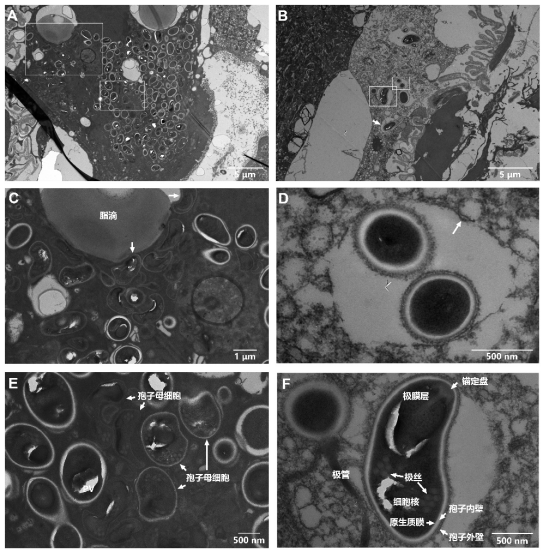 图2 克氏原螯虾肝胰腺细胞中的虾肝肠胞虫