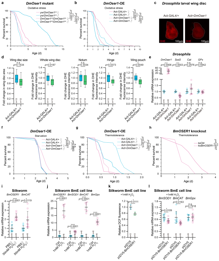 在果蝇中的研究表明,DmOser1功能缺失显著降低果蝇对于氧化应激的抵御能力,果蝇的寿命缩短,而DmOser1表达增强则能显著提升果蝇对于氧化应激的抵御能力(图5a-b);果蝇翅原基氧化模型中的研究也表明DmOser1能够显著降低氧化损伤的程度,通过饥饿和热激2种方式诱导的氧化应激研究也获得了类似结果(图5c-h)。家蚕个体和细胞中的研究结果表明OSER1能够响应氧化应激的刺激(图5i-j),过表达BmOSER1后,氧化应激水平被显著抑制,并能够回复被氧化应激提升的BmSOD1和BmCAT的表达水平(图5k-l)。