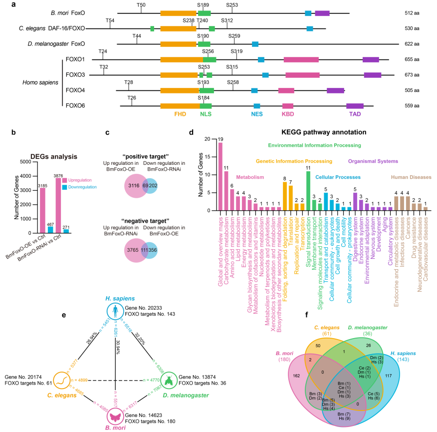 FOXO转录因子调节与衰老相关的途径并影响寿命,但介导这些影响的靶点在很大程度上仍然未知。本研究首先查明,寿命调节因子FOXO(s)在不同模式动物间的二级结构具有较高保守性,这为利用家蚕筛选FoxO靶基因提供了依据(图1a)。通过在家蚕BmN-SWU1细胞中上调或下调FoxO的表达水平,结合转录组测序和差异表达分析,筛选到FoxO的候选靶基因180个,其中上游调控区域含有FoxO结合基序的基因有42个(图1b-d)。比较基因组学分析发现,人类基因组中家蚕、线虫、果蝇的直系同源基因占比分别约为30.94%、26.94%和32.20%,即家蚕处于中位(图1e)。分析四个物种中已报道的所有FoxO直接靶基因,显示其中为四个物种共有的靶基因仅1个(图1f),相关保守性因子的鉴定还很匮乏。