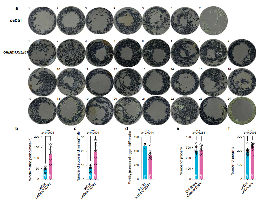 在家蚕中,过表达BmOSER1增强了雄蛾的交配活力,有效交配次数大幅增加,而敲除BmOSER1则降低了雌蛾的产卵量;在秀丽隐杆线虫中,Ceoser1过表达能够显著提升子代数量。这些结果共同证实了OSER1在繁殖中的重要调节作用(图8)。