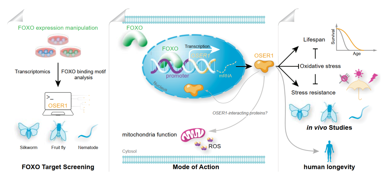 代方银教授团队发现了调控寿命的新基因OSER1,并在家蚕、线虫、果蝇等多物种中研究揭示了其通过提升机体对氧化应激的防御力而延缓衰老和延长寿命的保守性机制,且该基因对寿命的影响得到人类受试者研究结果支持,展示了OSER1作为实现健康衰老和延长寿命的关键调控靶标的重要前景。研究论文“FOXO-regulated OSER1 reduces oxidative stress and extends lifespan in multiple species”已于8月21日在国际知名期刊《自然通讯》(Nature Communications)在线发表。