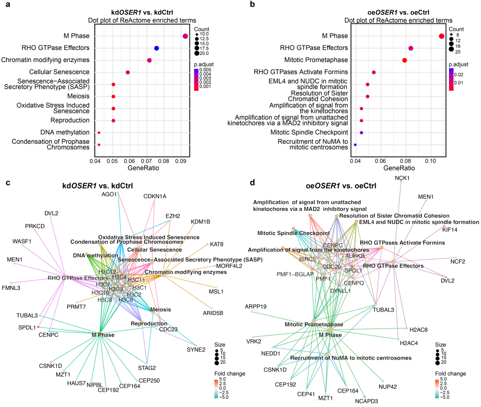 在人类U2OS细胞中,对OSER1过表达系和RNAi敲降系中的差异表达基因分析表明,OSER1被敲降后,差异表达基因主要富集在细胞衰老、衰老相关分泌表型(SASP)、氧化应激诱导的衰老、繁殖等生物学过程,这些生物学过程之间存在密切的关联(图7)。