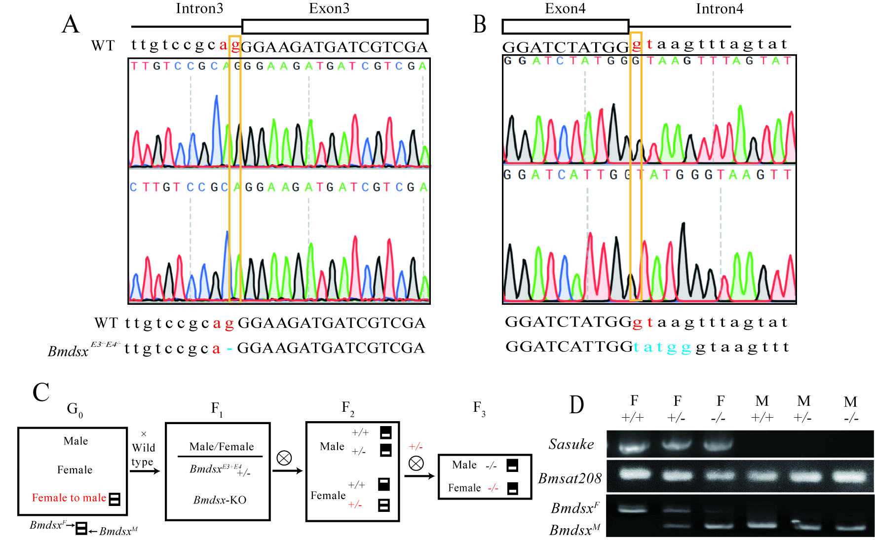 本研究创新性采用CRISPR/Cas9介导的同源修复技术,精准靶向Bmdsx基因的雌性特异性外显子剪接位点(E3的5’端与E4的3’端),通过诱导单碱基突变(G→A)破坏剪接供体/受体位点,强制雌性个体跳过E3和E4外显子,使雌性转录本(BmdsxF)向雄性转录本(BmdsxM)转变(图1)。