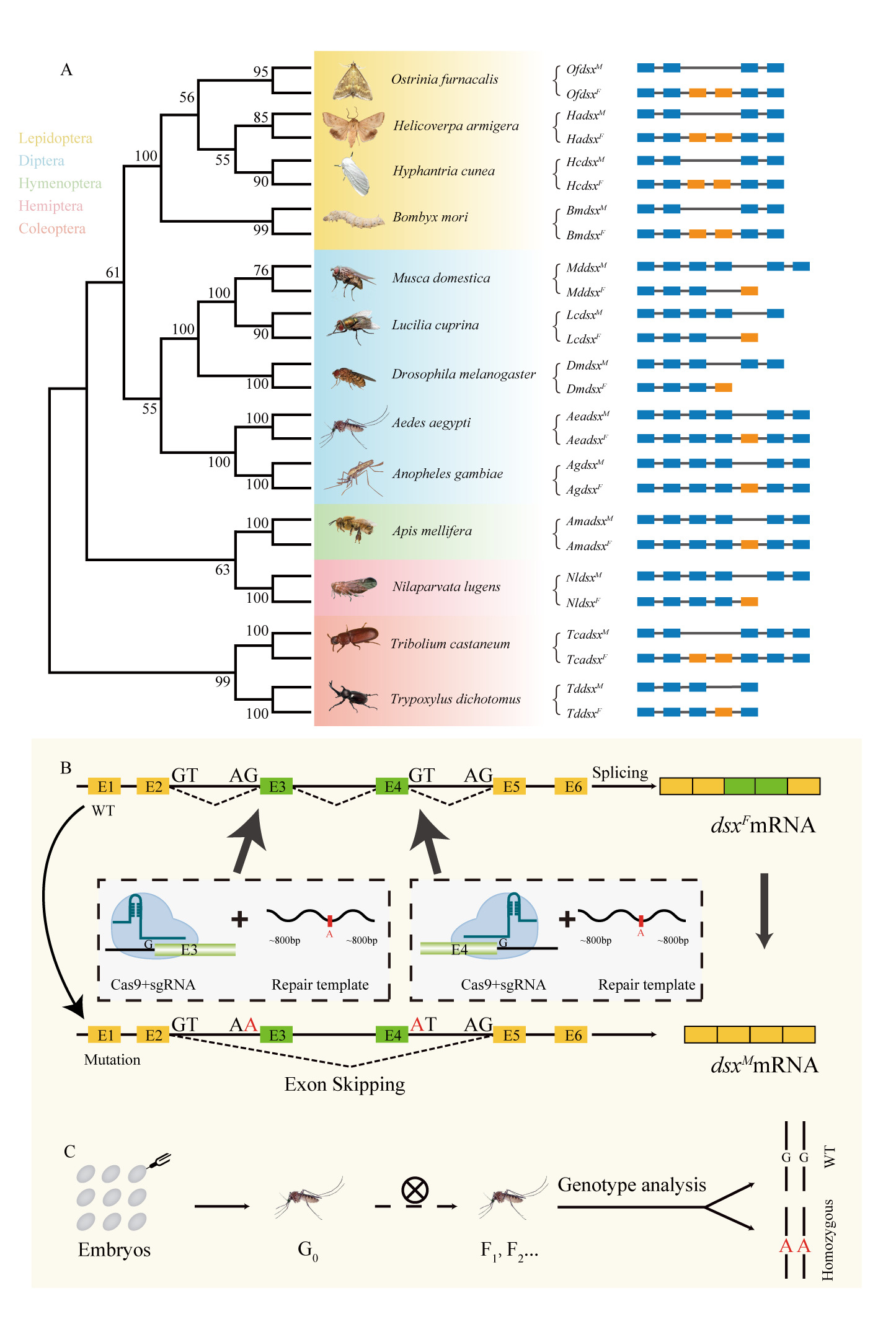 家蚕(Bombyx mori)作为重要的经济昆虫,其雄蚕因抗逆性强、产丝质量高、料丝转化率高而更受蚕丝产业青睐,因此,培育全雄蚕品种成为蚕业发展的重要期盼。以往研究对家蚕性别决定相关基因进行了探索,但都未能实现家蚕的完全性别逆转。Doublesex(dsx)是昆虫性别分化的关键下游调控因子,其雌雄特异性剪接变体(BmdsxF/BmdsxM)调控性二型的塑造。通过精准编辑Bmdsx基因的剪接位点,有望实现雌性向雄性的完全转化。