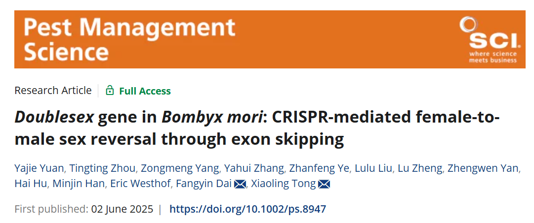 近期,西南大学资源昆虫高效养殖与利用全国重点实验童晓玲教授课题组在中科院1区TOP期刊Pest Management Science上发表题为“Doublesex gene in Bombyx mori: CRISPR-mediated female-to-male sex reversal through exon skipping”的研究论文。该研究首次通过精准编辑家蚕性别决定关键基因Bmdsx(Bmdoublesex)的雌特异性外显子剪接位点,成功实现了家蚕雌性向雄性的性别逆转,为经济昆虫育种及害虫生物防治开辟了新的技术路径。