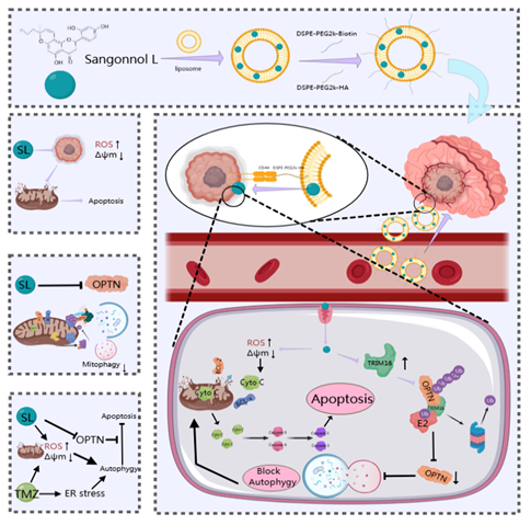 胶质母细胞瘤作为颅内常见的恶性肿瘤,具有恶性程度高、治疗难度大、预后差等特点,化疗耐药是临床治疗中面临的核心挑战之一。替莫唑胺作为当前治疗胶质母细胞瘤的一线化疗药物,其疗效常受肿瘤细胞耐药性影响。崔红娟教授团队的研究,从桑树资源中挖掘潜在活性物质,最终锁定桑根醇L这一关键化合物。研究证实,桑根醇L可通过精准调控TRIM16-OPTN信号轴,发挥双重作用:一方面有效抑制肿瘤细胞的线粒体自噬(Mitophagy),阻断肿瘤细胞通过自噬途径清除受损线粒体、维持自身存活的逃生机制;另一方面显著诱导肿瘤细胞凋亡(Apoptosis),促进肿瘤细胞死亡。这一机制直接增强了替莫唑胺对胶质母细胞瘤细胞的杀伤效果,成功逆转了部分肿瘤细胞的耐药特性。团队还创新性地构建了靶向递送SL的脂质体纳米系统可精准靶向肿瘤部位,大幅提高桑根醇L在脑内的富集浓度,有效解决在体内递送效率低、靶向性差的问题。