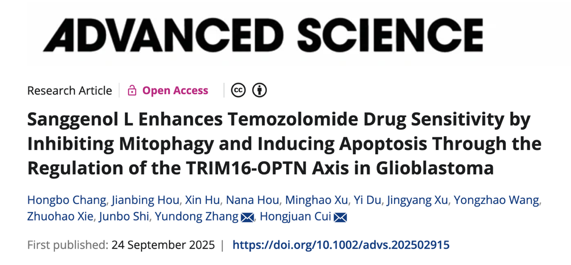 2025924日,西南大学人人体育app 崔红娟教授课题组在国际top学术期刊《Advanced Science》(中科院1TOP期刊,2024年影响因子IF=14.1)在线发表了题为“Sanggenol L Enhances Temozolomide Drug Sensitivity by Inhibiting Mitophagy and Inducing Apoptosis Through the Regulation of the TRIM16-OPTN Axis in Glioblastoma”的研究成果。该研究首次从桑树活性成分中成功筛选出具有显著抗胶质母细胞瘤活性的天然小分子化合物——桑根醇LSanggenol L,简称SL),并系统揭示了其增强替莫唑胺(Temozolomide,简称TMZ)化疗敏感性的全新作用机制,为胶质母细胞瘤化疗耐药难题提供了关键实验依据与治疗新思路。