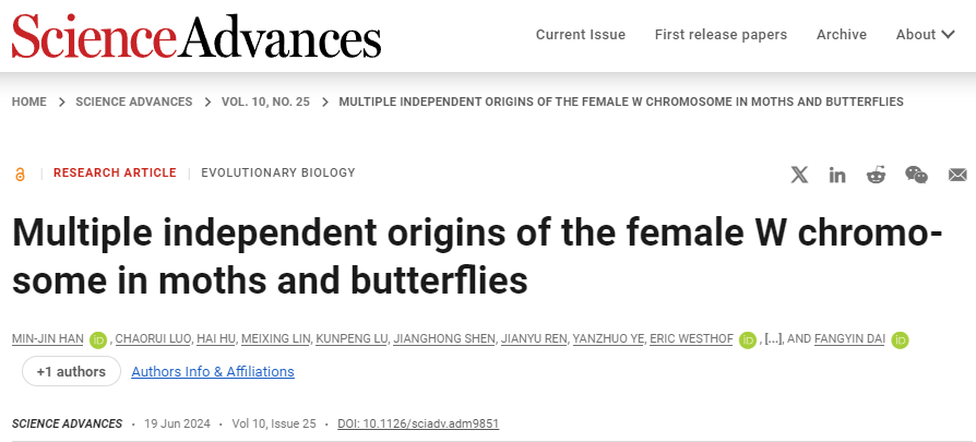 2024619日,国际著名期刊Science AdvancesScience综合性子刊)在线发表了西南大学人人体育app 代方银教授团队题为“蛾类和蝶类昆虫雌性W染色体的多重独立起源”(Multiple independent origins of the female W chromosome in moths and butterflies)的研究论文。该研究首次获得了家蚕W染色体完整基因组序列,并揭示鳞翅目昆虫W染色体起源与进化的新机制。研究结果不仅在基因组与进化生物学领域具有重要理论意义,而且在家蚕等鳞翅目昆虫的性别调控的研究方面具有重大价值,并为家蚕分子育种带来新的前景。