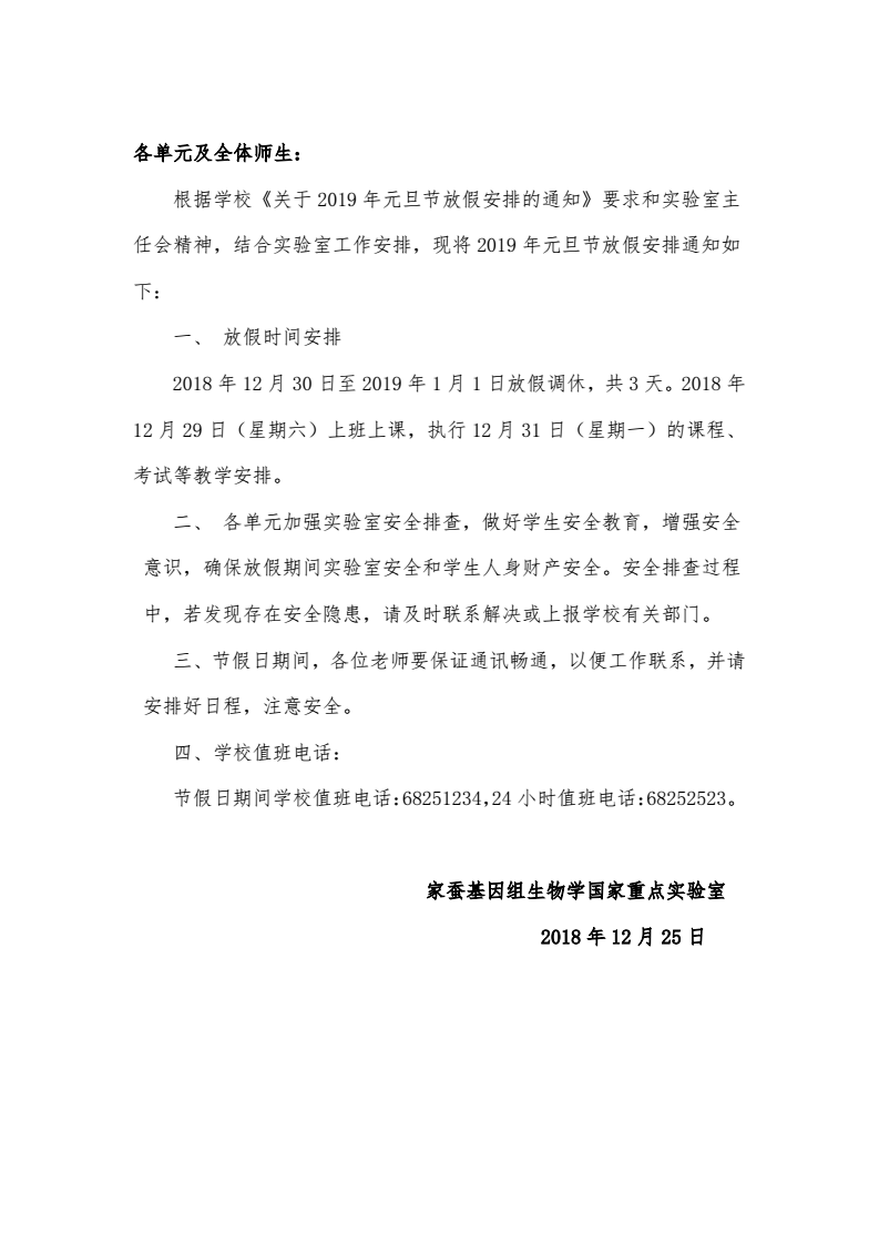 家蚕基因组生物学国家重点人人体育app 关于2019年元旦节放假安排的通知