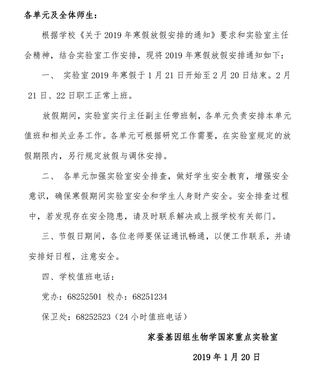 家蚕基因组生物学国家重点人人体育app 关于2019年寒假放假安排的通知