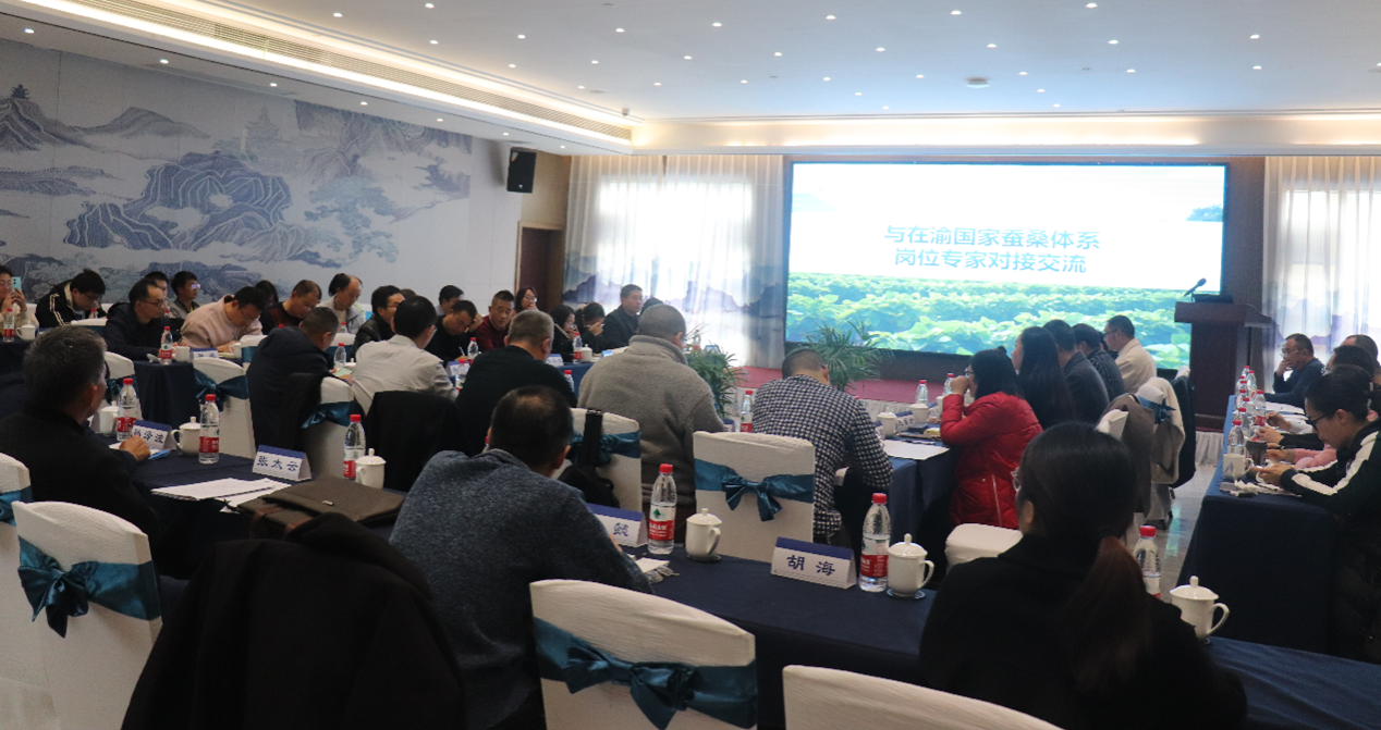 重庆市黔江区林业局副局长潘国权、巫溪县林业局副局长吴成林、涪陵区经作中心研究员孙波、大足区埂生基生态农业有限公司总经理倪蓓华、潼南区农业科技推广站站长郭湘、云阳县农业技术服务中心副主任向晓峰、奉节县林业局农艺师刘奎、重庆汇田机械制造有限公司董事长张益佳分别介绍了各区县蚕桑产业的基本情况、存在问题和主要诉求,或企业技术研发情况。重庆市蚕桑产业技术体系及相关部门积极响应,做到“有疑必答,有惑必解”,并将采取相关措施推动各区县蚕桑产业的高质量发展。随后,重庆市蚕业总站余华献副研究员代表市蚕业总站站长、市蚕业技术体系前任首席专家王万华研究员发表指导讲话。对接交流由赵爱春教授和王庆一级调研员先后主持。