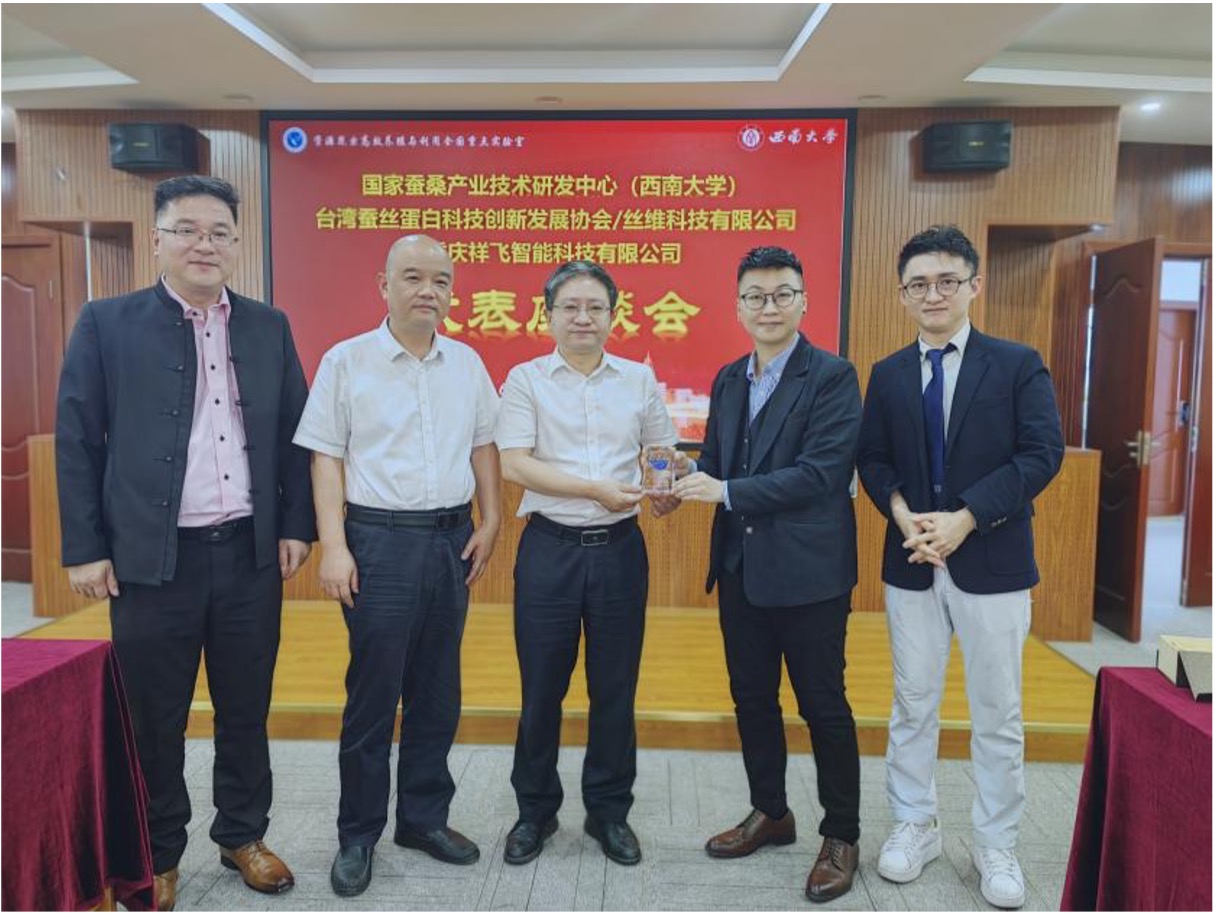 2024年6月4日,台湾蚕丝蛋白科技创新发展协会理事长、丝维科技有限公司董事长陈孟专博士一行在重庆祥飞智能科技有限公司周永忠董事长等陪同下到访西南大学人人体育app