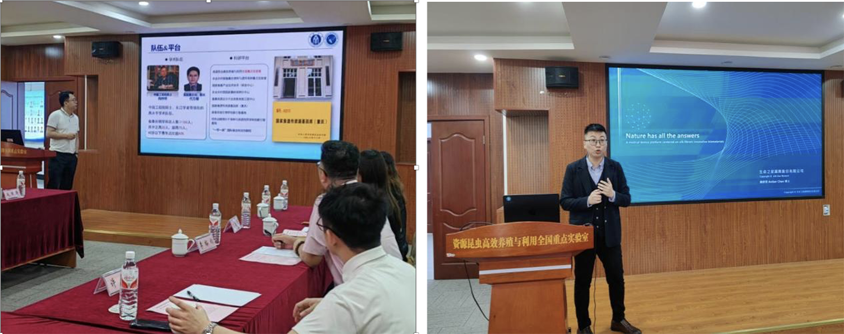 在蚕丝遗传改造与利用研究方面的主要进展。陈孟专博士就其领导的协会和公司推动的蚕丝蛋白循环经济模式相关研究作了交流报告,重点介绍了蚕丝蛋白医用产品研发进展。与会人员围绕蚕丝新功能产业发展进行了热烈讨论。