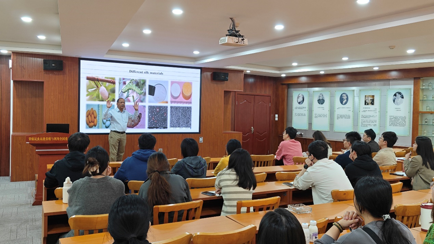 11月7日上午,Kundu院士在科技楼407报告厅作了题为 “Engineering of Natural Silk Biomaterials for 2D and 3D in vitro Cell Culture and Biomedical Applications” 的专题学术报告,深入解析了蚕丝生物材料在细胞生物学、组织工程、药物递送以及再生医学等领域的广泛应用。报告会现场,Kundu院士与参会的师生们围绕蚕丝生物材料的结构调控、功能改性及临床转化等核心议题展开了热烈的讨论和互动。