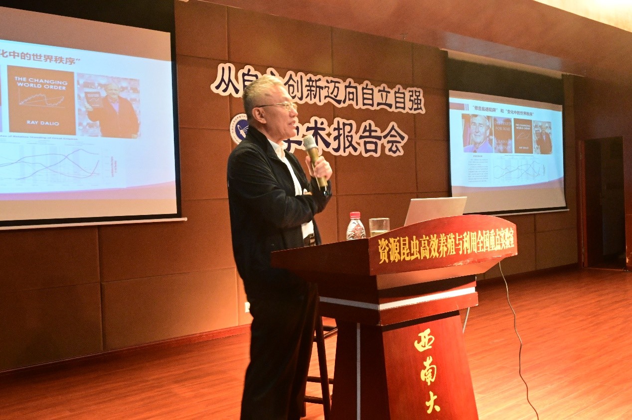 12日下午,邢继俊博士以“从自主创新迈向自立自强——新形式下开展国际科技合作探讨”为题,面向西南大学师生作了一场别开生面的学术报告。代方银教授主持报告会,近300人参加了报告会。邢博士的报告,从“百年未有之大变局”的大背景、大视角出发,结合自身丰富阅历、掌握的全面信息,生动阐述国际发展环境发生深刻变化,科技创新成为关键变量,新一轮科技革命和产业变革未来将来,中国志在必强,要坚持高水平开放合作的必要性和重大意义。报告赢得师生的热烈掌声,邢博士还现场解答了师生提出的问题。