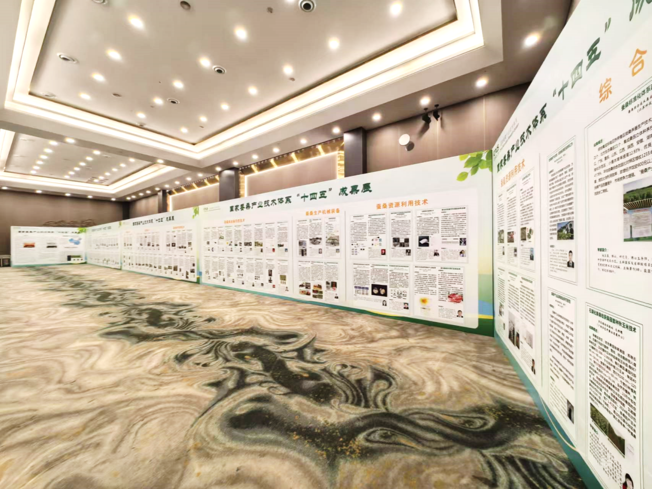 会议期间,设有国家蚕桑产业技术体系“十四五”成果展。“十四五”以来,国家蚕桑体系针对蚕桑产业发展中的关键共性技术瓶颈,重点围绕“蚕桑现代高效绿色种养生产关键技术研发与应用”和“桑蚕茧丝资源多元高效利用关键技术研发与应用”两大主线任务开展攻关,构建产业基础数据平台,实施“百项技术列装全产业链工程”,取得了十分突出的成效。本次共展示成果107项,分为9个方面,其中数据平台构建及种质资源6项、蚕育种技术与新品种25项、桑树新品种7项、蚕养殖技术13项、桑树栽培管理技术11项、蚕桑病虫害防控技术18项、蚕桑生产机械装备6项、蚕桑资源利用技术16项、综合技术5项。