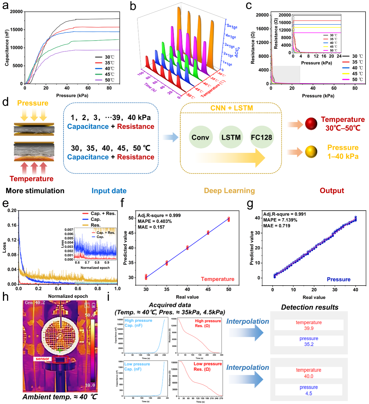 得益于蚕茧离子凝胶在不同温度下载流子迁移率的变化特性,利用电容与电阻双通道输出信号,并引入深度学习回归模型,有效解耦温度与压力混合信号,实现双模态精准感知。在30–50°C温度区间内,温度和压力感知线性度高达0.999和0.991,回归模型的平均绝对百分误差(MAPE)分别为压力7.139%、温度0.403%,展现出高度精确的环境适应能力。