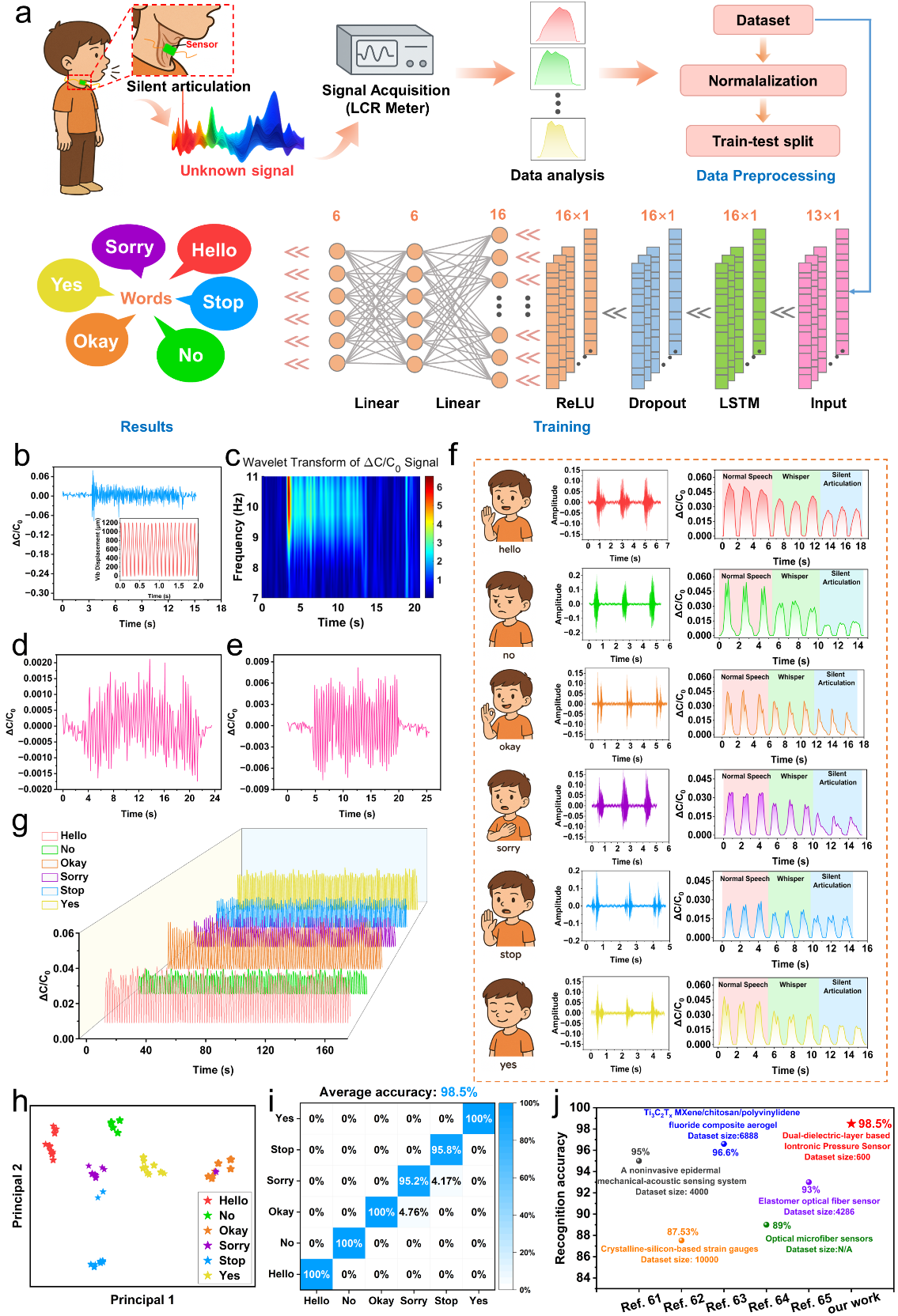 在静音语音识别(Silent Speech Recognition, SSR)场景中,通过在喉部佩戴DLIPS,采集说话者在不发声状态下的喉部肌肉活动所引起的微小皮肤变形信号,结合LSTM神经网络模型,传感器可实现对“hello”、“no”、“yes”等6个常用词的准确识别,整体识别率高达98.5%。该技术有望在聋哑人辅助交流、隐蔽语音交互、智能穿戴设备等领域实现广泛应用。