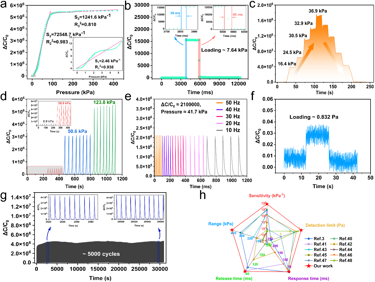 该传感器在6–100 kPa压力区间内的灵敏度高达72548.7 kPa-1,工作区间覆盖0.001–420 kPa,响应时间和恢复时间快至30 ms和60 ms,对连续压力和不同频率的压力表现出优异的响应,检测下限可达0.832 Pa,耐久性超过5000次循环。这些性能指标在柔性压力传感器领域处于领先水平。