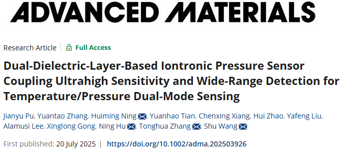 研究人员题为“Dual-Dielectric-Layer-Based Iontronic Pressure Sensor Coupling Ultrahigh Sensitivity and Wide-Range Detection for Temperature/Pressure Dual-Mode Sensing”的最新研究成果。该研究利用天然材料蚕茧制备而成的蚕茧离子凝胶与多孔聚氨酯泡沫形成双介电层结构,基于该双介电层结构的离子电子压力传感器耦合超高灵敏度和宽范围检测,在温度/压力双模传感和静音语音识别中表现出巨大潜力。
