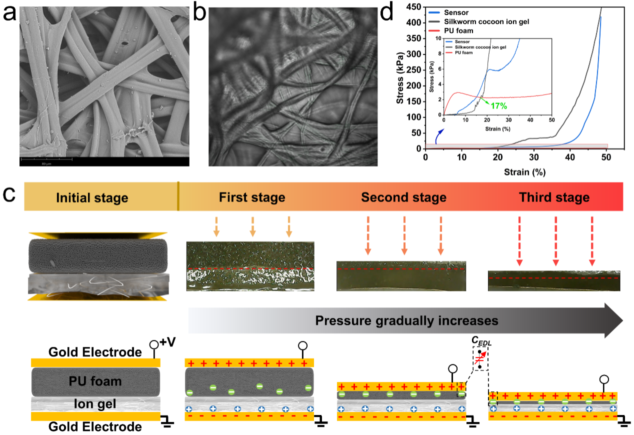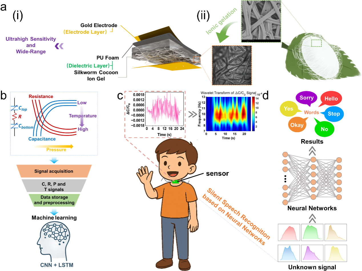 研究人员利用天然蚕茧的多孔结构,制备出高介电常数的蚕茧离子凝胶(SCOG),作为传感器的上层介电材料。下层则采用高压缩性的开孔聚氨酯泡沫(PU foam),形成双介电层结构。这种结构设计不仅提高了传感器的灵敏度,还扩展了其工作压力范围。基于该结构的离子电子压力传感器(DLIPS)利用机器学习还能成功对温度和压力进行解耦,并在静音语音识别系统中表现出巨大的潜力。