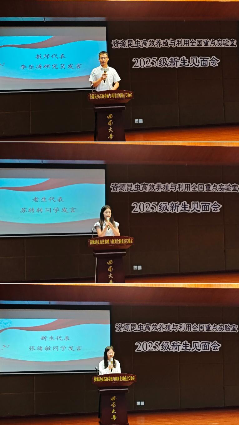 教师代表李乐涛研究员在发言中指出,研究生阶段是历练关键期,核心任务是学习前沿科技,直面科研挑战。他告诉同学们:“静心是心态,让你沉得下去;专注是方法,让你钻得进去;坚持是行动,让你走得下去。静心,方能专注;专注,才值得坚持;坚持,终能成就。从今天起,愿你们能静心修身,专注求学,坚持逐梦。期待几年后,在毕业典礼上,遇见一个因沉静而睿智、因专注而强大、因坚持而卓越的你!” 老生代表苏转转同学结合自身科研与生活经历,分享了“目标引领成长”的心得,鼓励新生尽早锚定研究方向。新生代表张绪敏以国创实践、升学经历为切入点,展现了青年学子对科研的热忱与规划。她表示未来将以“严谨求实、追求创新”的态度投入研究生学习,立志将个人发展融入国家农业科技进步事业。