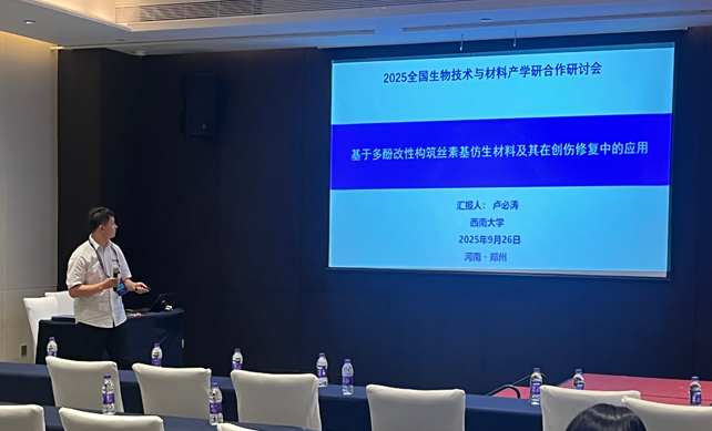 、蚕桑纺织与生物质科学学院、医学研究院师生代表参会,并在多个分论坛作专题报告。龙定沛研究员受邀在“前沿生物技术与合成生物制造论坛”作“分子改良蚕丝:机制基础与工程创新”报告;卢必涛副教授受邀在“再生医学与生物材料临床转化论坛”作“基于多酚改性构筑丝素仿生材料及其在创伤止血中的功能研究”报告;高飞燕副教授受邀在“生化传感技术及应用论坛”作“模块化微针递送系统的构筑及其在乳腺癌围手术期免疫治疗中的应用”报告;医学研究院李丽博士后受邀在“生物基纤维材料论坛”作“三维纳米结构化支架在组织再生修复中的应用研究”报告。