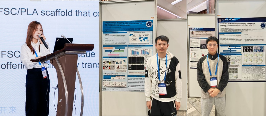 在学术交流环节,博士生张茜作题为 “Osteoimmunity-Regulating Biospun 3D Silk Scaffold for Bone Regeneration in Critical-size Defects” 的口头报告,聚焦骨免疫调控与丝素三维支架的耦合策略,凭借扎实研究与清晰表达,获分论坛“Best Oral Presentation”奖。博士生刘玉隆与朱思宇完成专题墙报展示,围绕蚕丝材料在组织工程与再生医学中的应用探索展开交流。相关工作呈现了人人体育下载